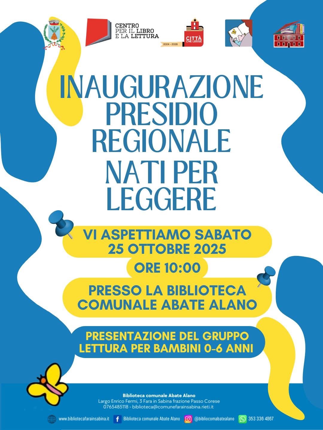 FARA SABINA - Sabato 25 ottobre alle ore 10.00, presso la Biblioteca comunale Abate Alano di Fara in Sabina, si terrà l’inaugurazione del Presidio regionale “Nati per Leggere”, un riconoscimento che celebra l’impegno costante del Comune nella promozione della lettura fin dalla prima infanzia.